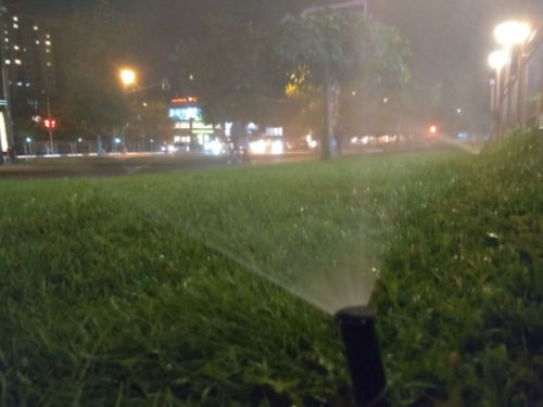 Вечерний полив травы у кафе.
